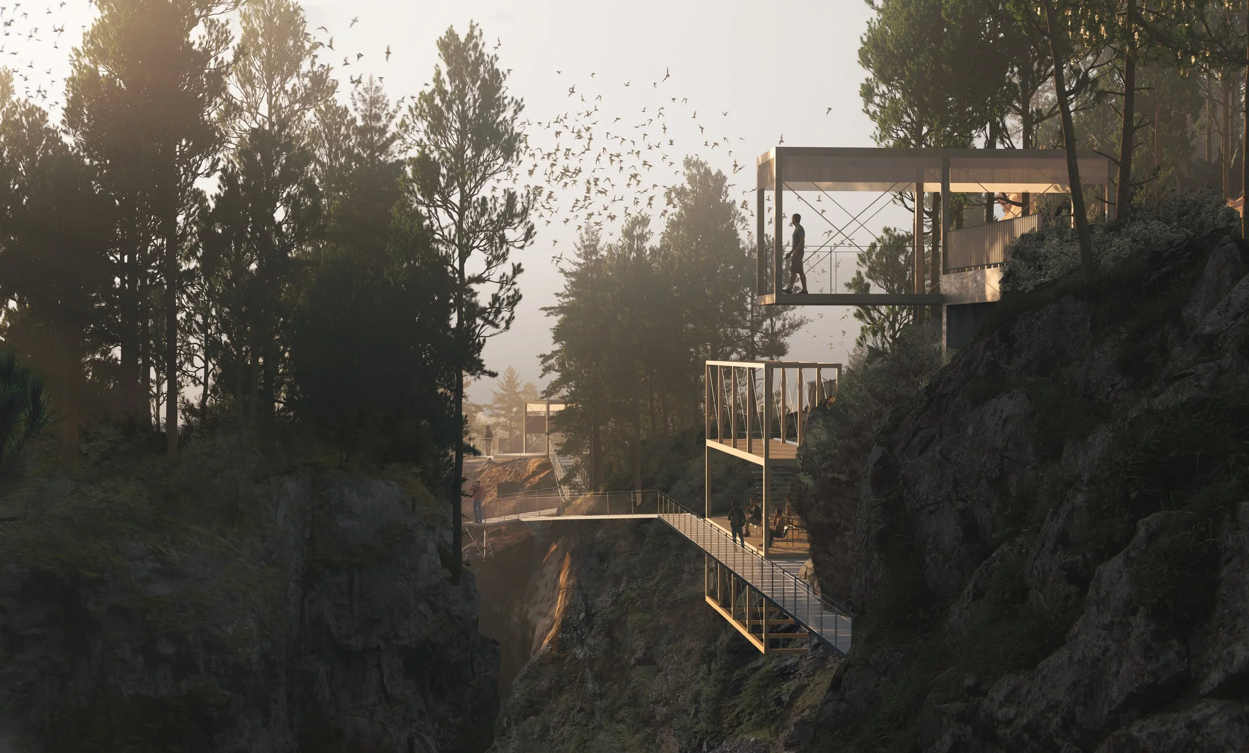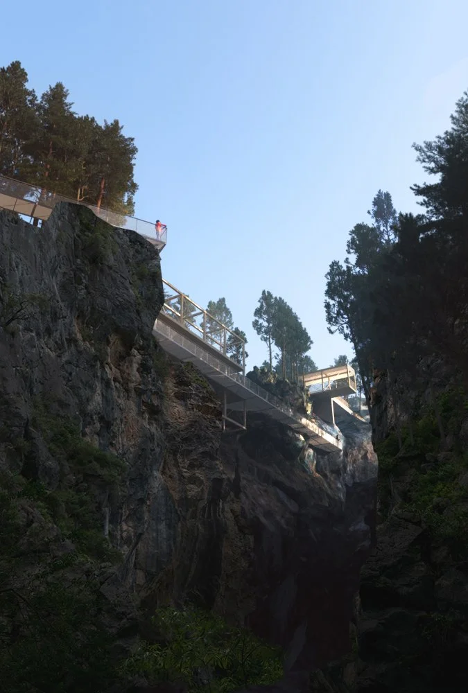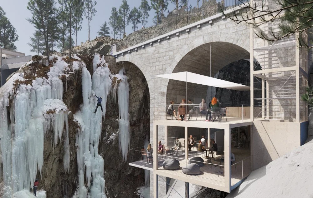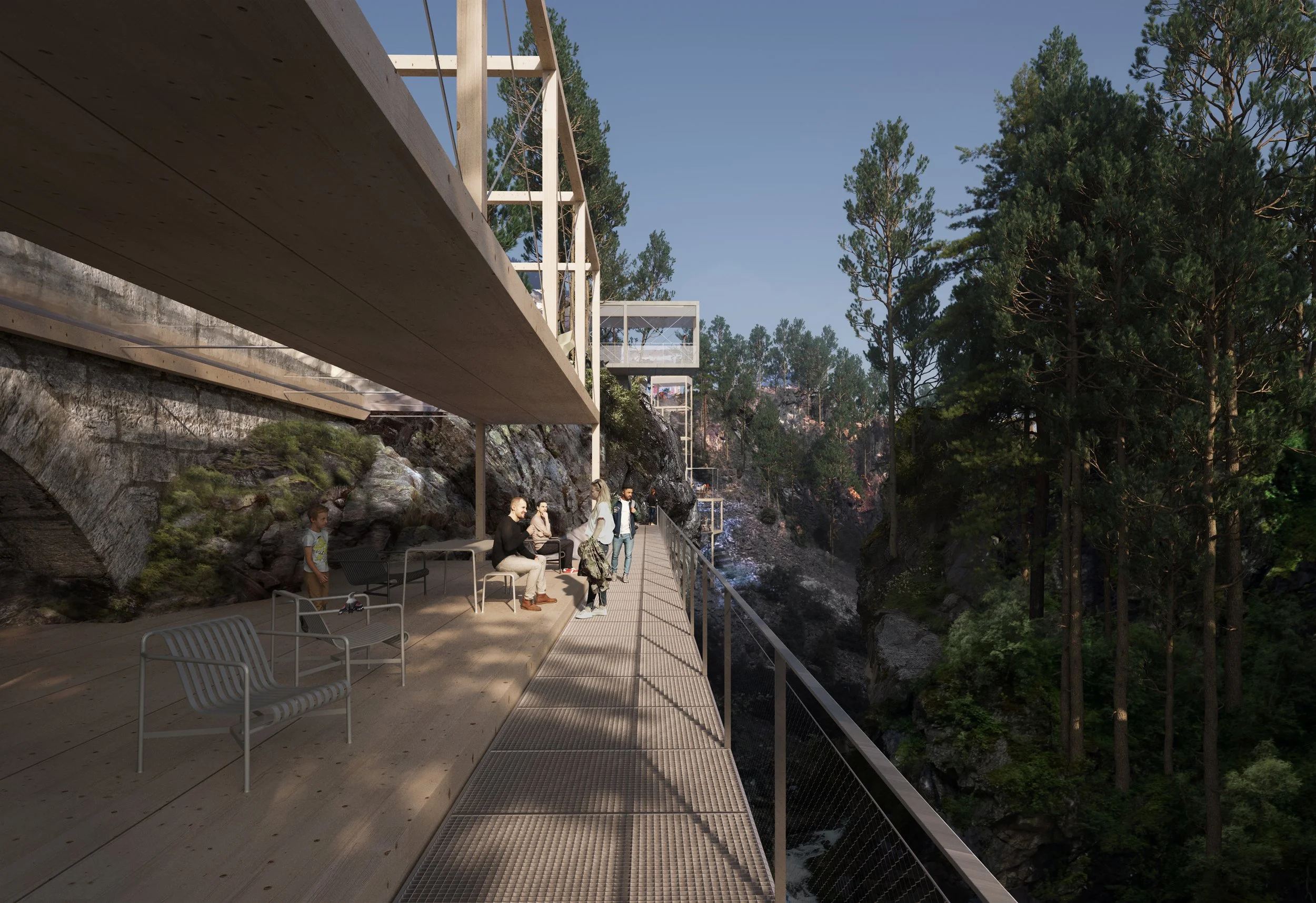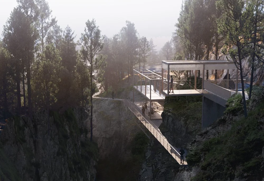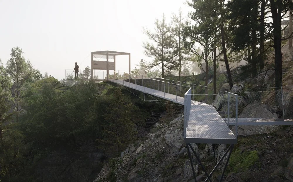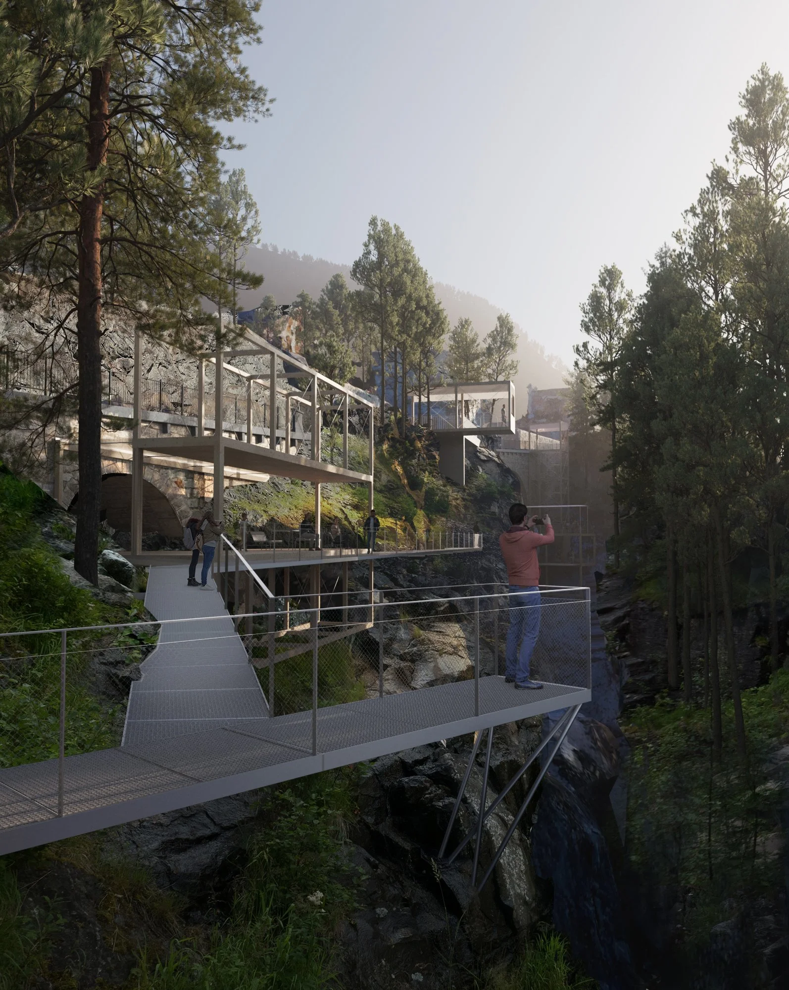 The municipality of Pontresina (GR, Switzerland) decided to make a canyon located in the center of the settlement more experiential by architectural means.